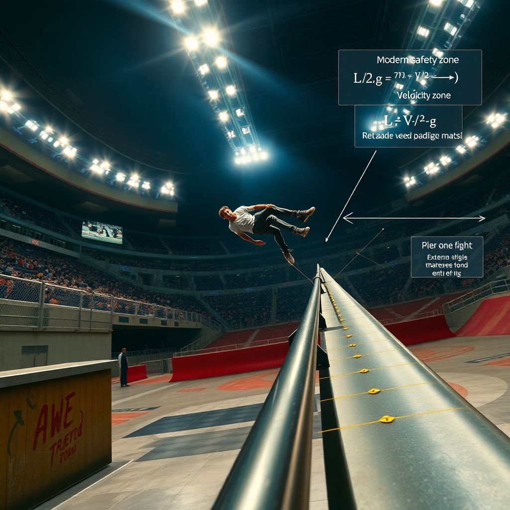 Инженеры и шейперы используют базовую механику: измеряют среднюю скорость разгона на участке (V, м/с), высоту вылета (h) и угол траектории. Дальше считают горизонтальный пролёт L ≈ V²/g при низком угле и добавляют запас 30–40%. Если потенциальный L упирается в зрительскую зону или бетон — конфигурацию спота меняют. Сегодня такие расчёты формально прописаны в регламентах крупных соревнований, а не остаются «интуицией шейпера», как было в начале 2000‑х.